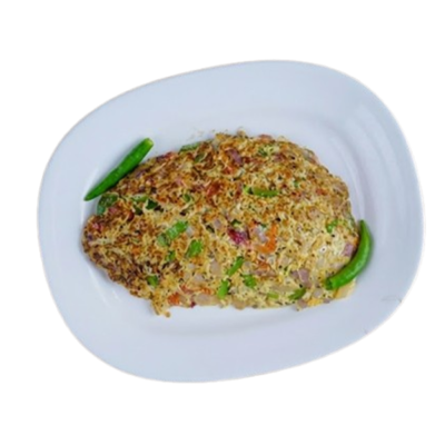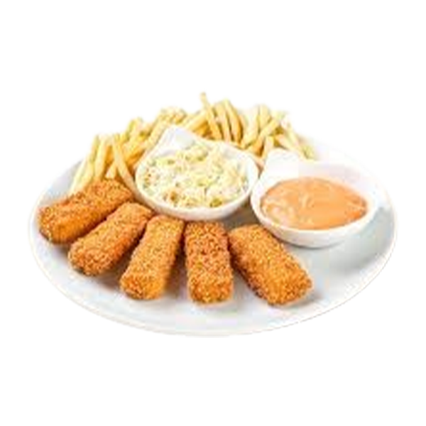 Breaded and deep-fried fish fillet, served with fries and sauce.
