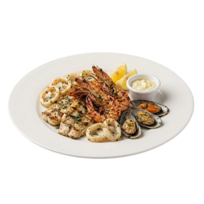 سمك مُغطّى بالبقسماط ومقلي بعمق، يُقدَّم مع البطاطس المقلية والصوص.