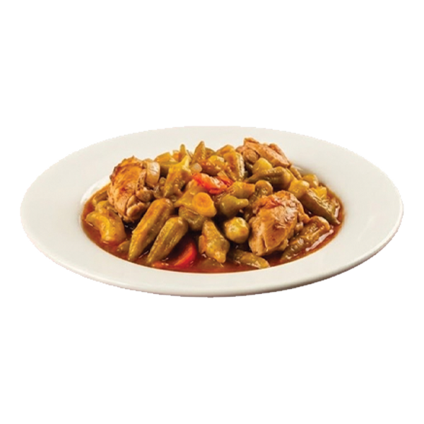 دجاج مطهو مع البامية في صلصة طماطم متبلة.