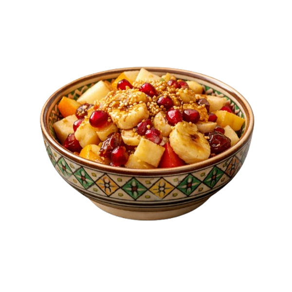 Fresh fruits with dates and pomegranate, drizzled with natural honey and toasted sesame.