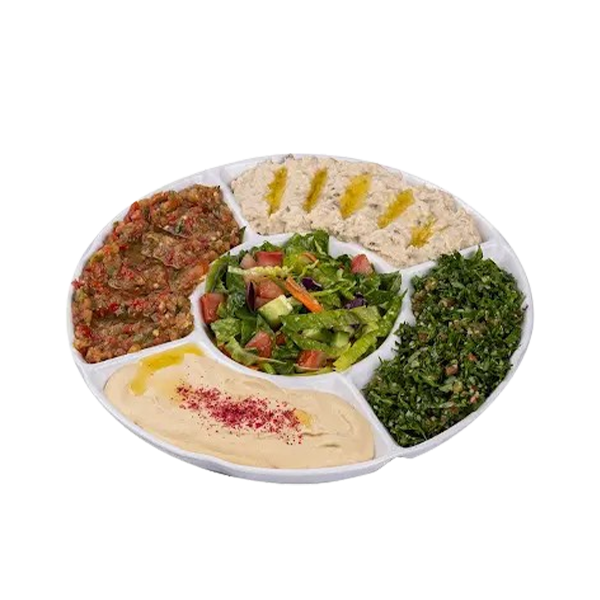 DE: Hummus, Moutabal, Salat, Brot EN: Hummus, moutabal, salad, bread AR: حمص، متبل، سلطات، خبز