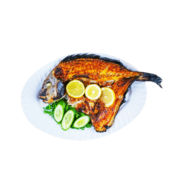سمك مشوي في فرن التنور ويُقدَّم مع الخضروات.