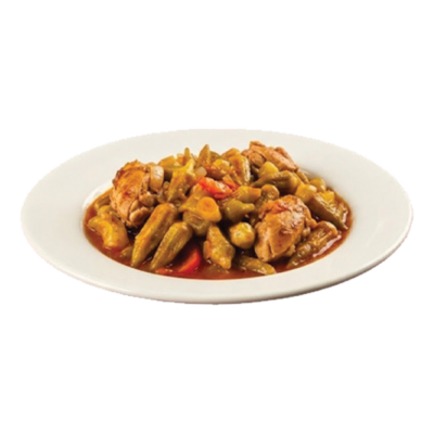 Hähnchenstücke mit Okra in gewürzter Tomatensauce gekocht.